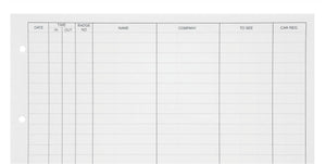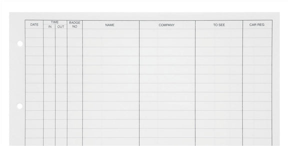 Refill for use with Guildhall Loose-Leaf Visitors Book. Designed for office receptions. Records date, time in/out, badge no., name, company, to see and car reg. Ruled for 18 entries per page. Leaf-Size: A4 210x297mm. 50 Sheets.