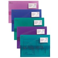 Polyplus is a heavy-duty polypropylene wallet file with two press-studs for added security. Business card pocket on front for personalisation. Gusseted sides for extra capacity. Assorted consists of pink, purple, turquoise, blue and green. Size: A4. Quantity 5.